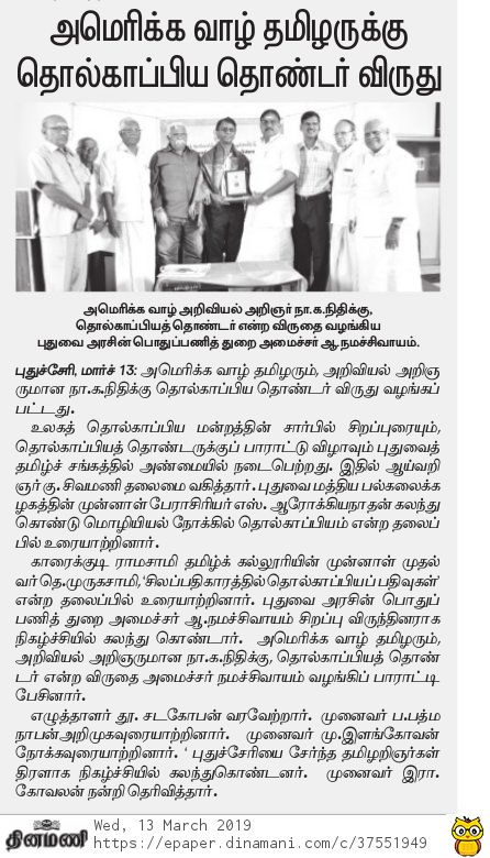 பாராட்டுப் பெறுவோர் : முனைவர் நா. க. நிதி கணினி அறிஞர் ,நியூ செர்சி, அமெரிக்கா அவர்கள்.