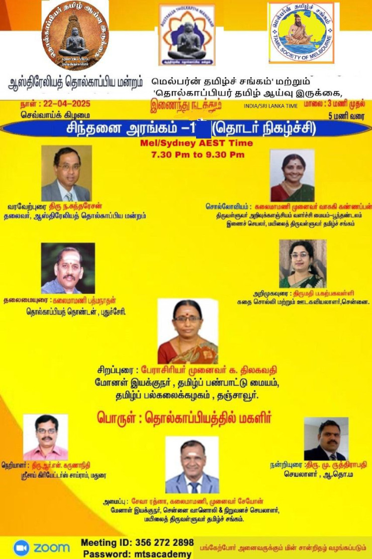 தொல்காப்பிய தமிழ் ஆய்வு இருக்கை-சிந்தனை அரங்கம்-1 , ஆத்திரேலிய-மெல்போர்ன். (22.04.2025),செவ்வாய் , மாலை 3:00 - 5: 00 மணி (இந்திய நேரம்).